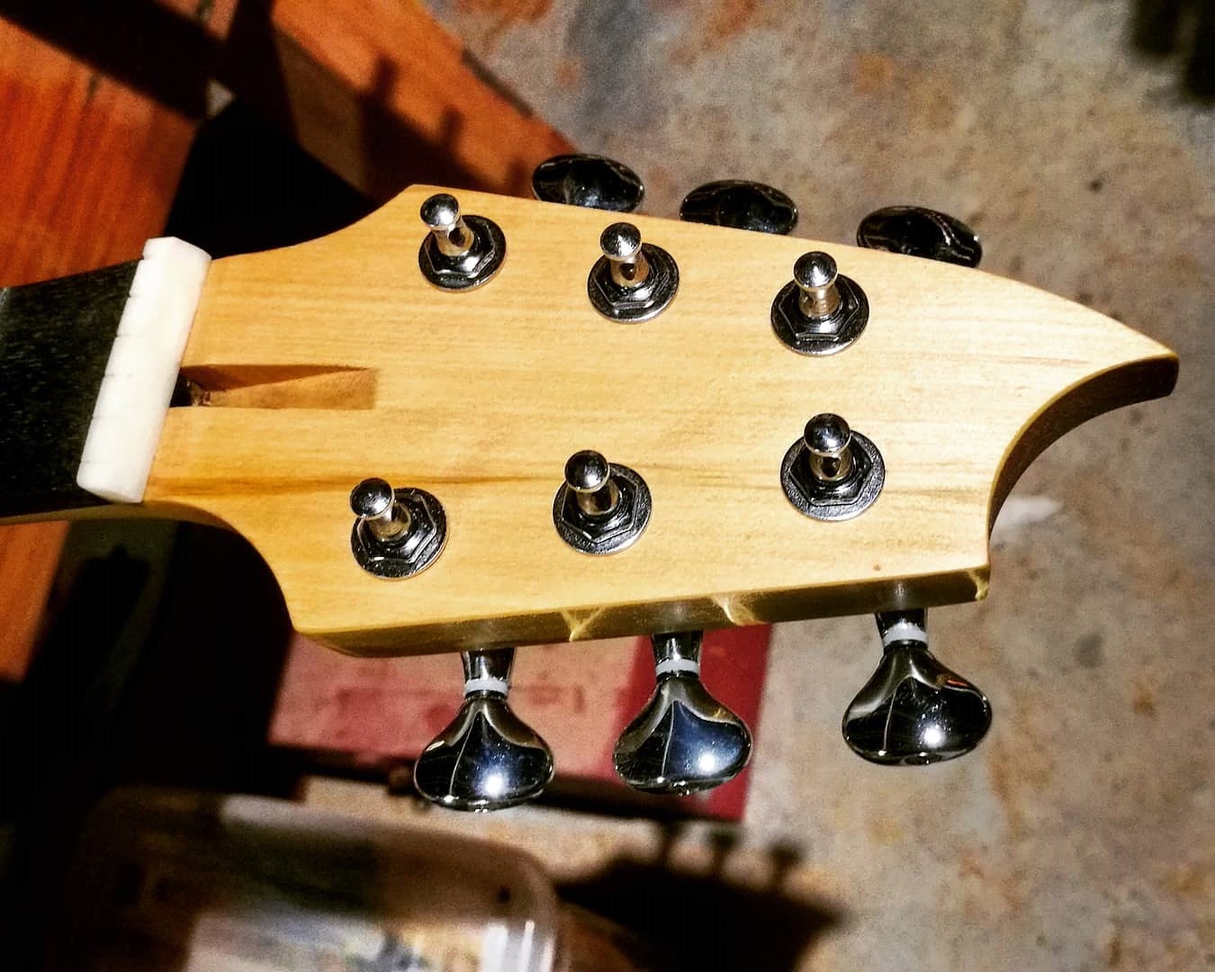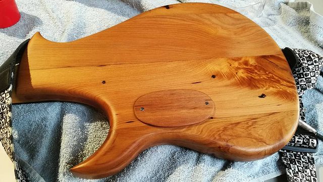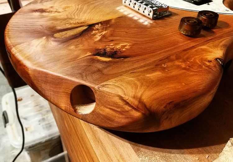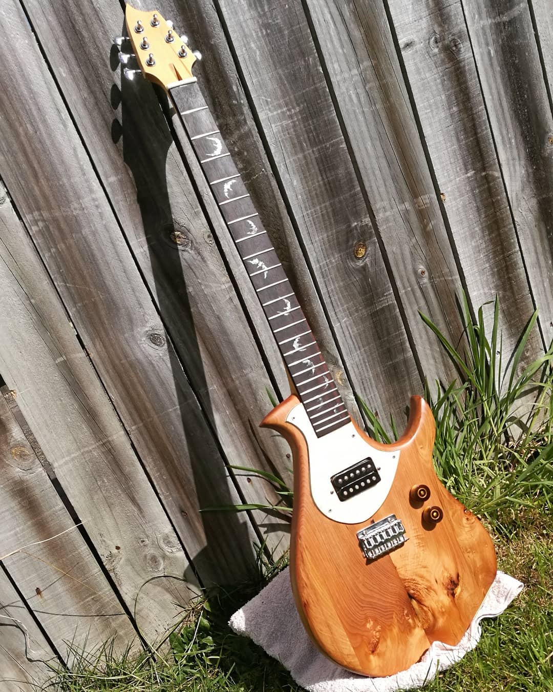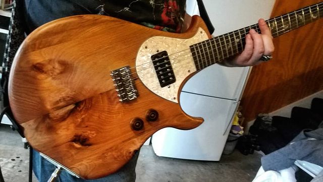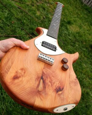 This is a version of the Flame made out of what many would consider “junk” timber, perhaps firewood. It was rough looking beam of a beautiful New Zealand timber called tÅtara, part of the frame of an old shed that had been torn down. The outside pieces of the body were made from recycled rimu, as was the neck. Most (although not all) of the wood I use in guitars is recycled, but I really love the way this one looks recycled. Here’s the video playlist of how I made it.