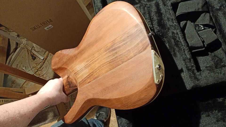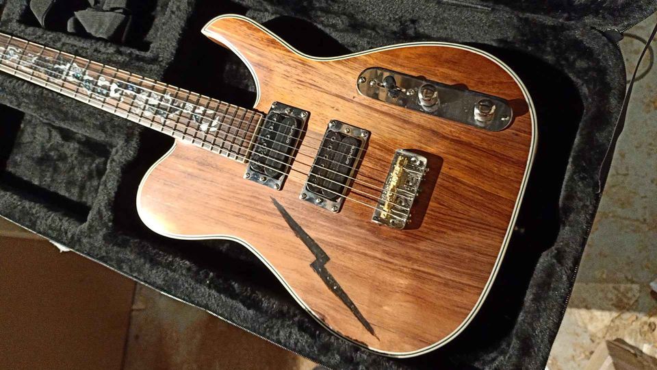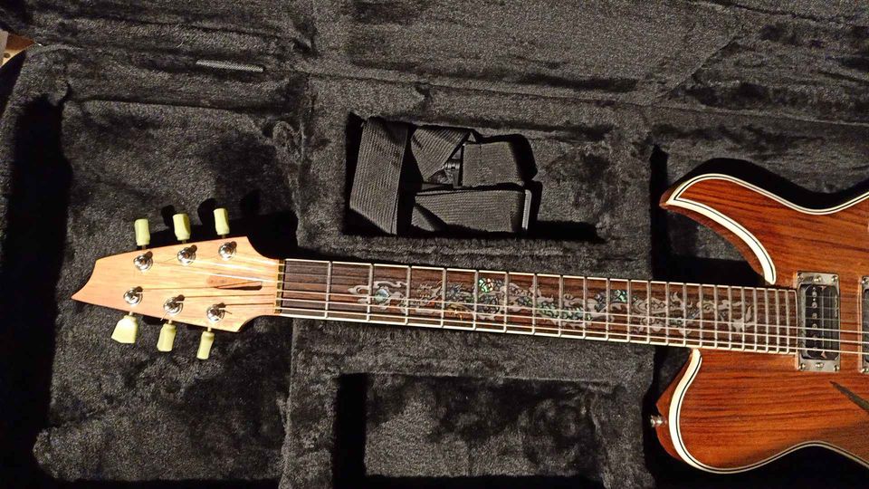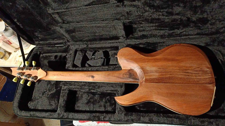I called this one a “Telly” because it draws some inspiration from the Fender Telecaster in the similar body shape, but that’s where the similarity ends. With its 24.75 inch scale, 3 tuners per side headstock, and its dual humbuckers, this thing is a curious mix. With sweet, clean tones, spanky strat sounds and the fattest overdrive you’ve ever heard, the Blackwood Telly may be the most versatile guitar I’ve built to date.