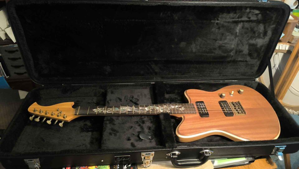 This guitar has a beautiful vintage look, in my opinion, with a sound to match. The price is $1,350 (including a case) plus $50 freight anywhere in New Zealand. If you’re in the Wellington or Manawatu region, you might even get an in-person delivery! It includes a case, and the strap buttons (pictured) were added after the photos were taken. Get in touch if you’re interested.
